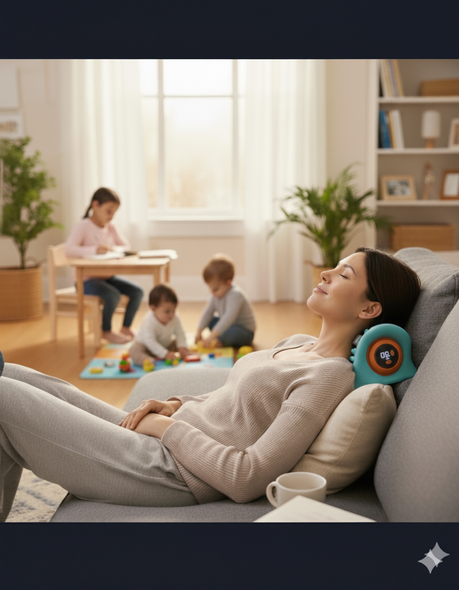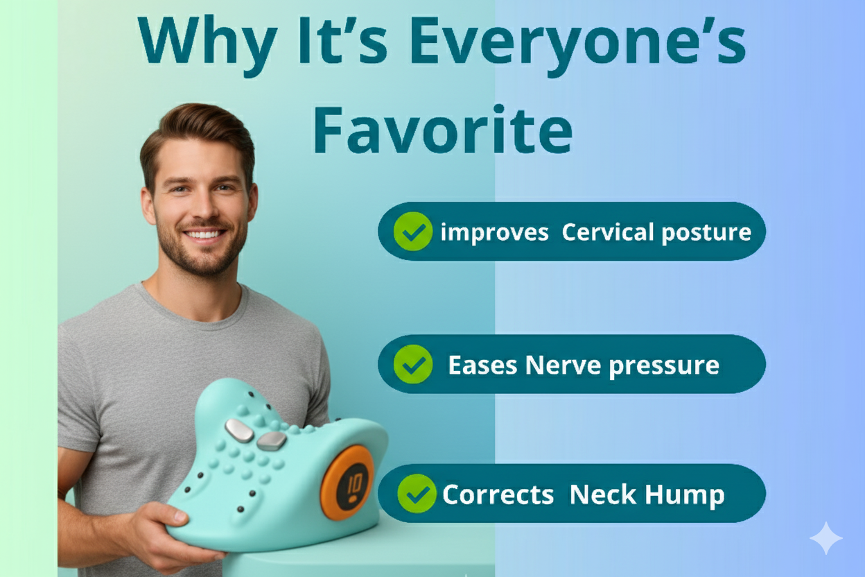 Modern life pushes your head forward, tightening neck muscles and restricting blood flow, which causes pain and stiffness. The Neck Massager uses EMS (Electrical Muscle Stimulation) to gently contract your muscles, boosting circulation while you lie at the perfect 26° angle. This relaxes your neck, restores its natural curve, and relieves pressure on your spine—the root cause of neck pain.